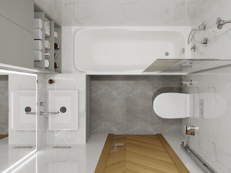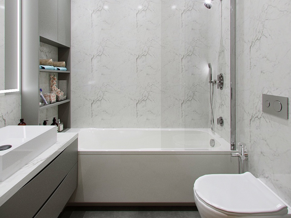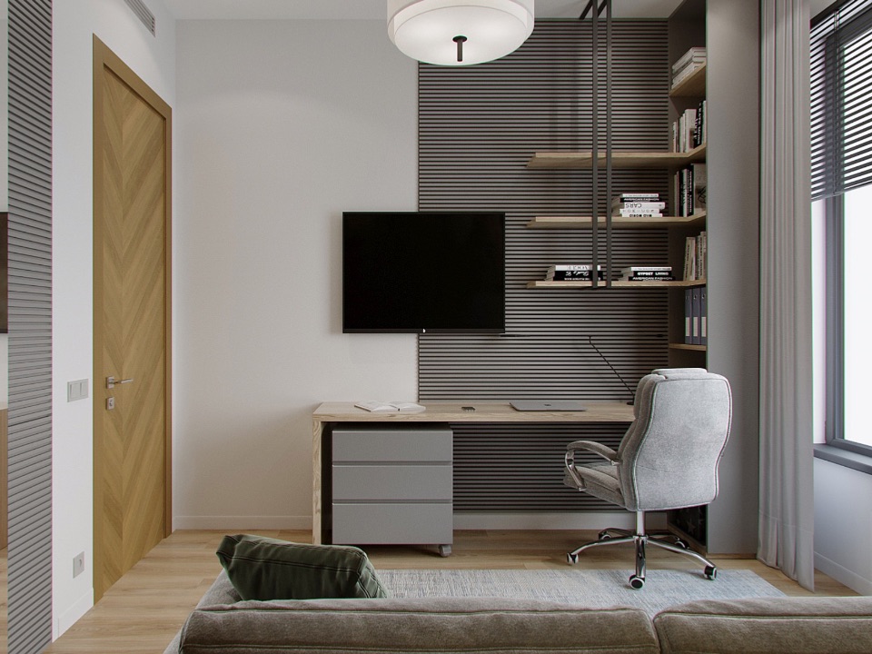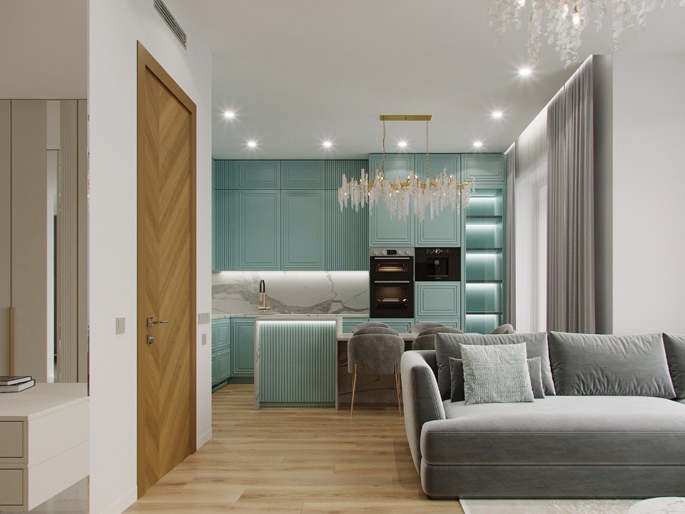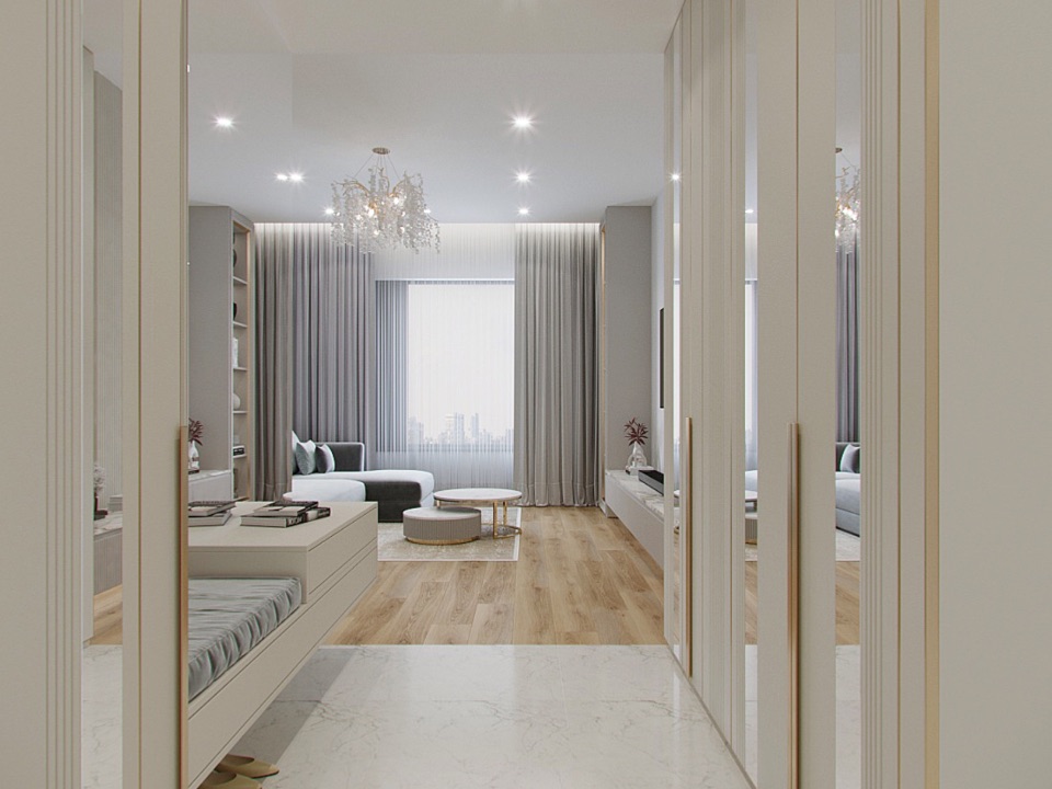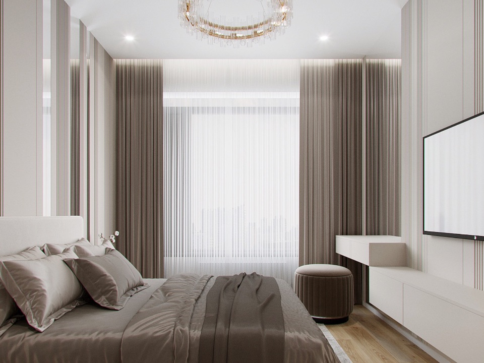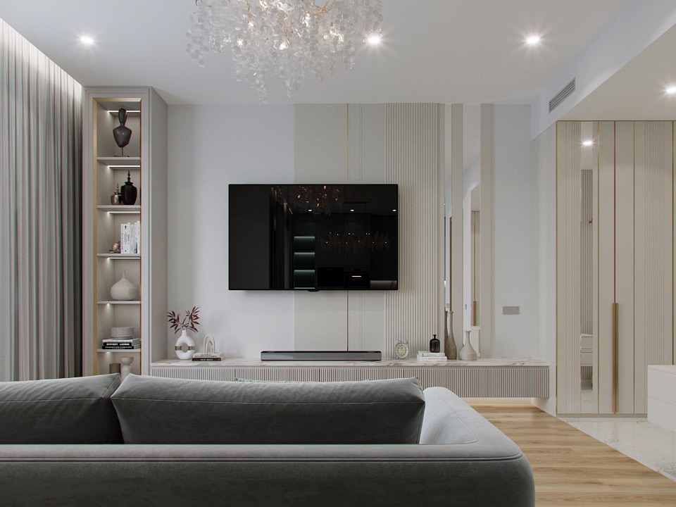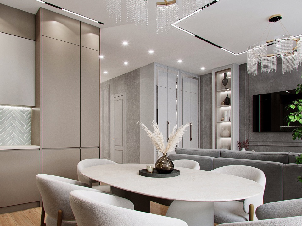 Отделка: стены под покраску; потолки — ГКЛ / натяжной; пол: ПВХ-плитка и керамогранит с тёплыми полами; воздухообмен и кондиционирование; санузел — керамогранит, сантехника; двери 2400; освещение; ниши и панели из ГКЛ с подсветкой, встроенные шкафы; кухня — встроенная, подсветка; шторы.